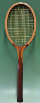 Bristol'I' wooden tennis racket having a regular handle c/w leather butt cap^ a concave wedge and original shoulder wrap^ thin gut strings and some wear to the decals on the throat^ has an oval head (G)