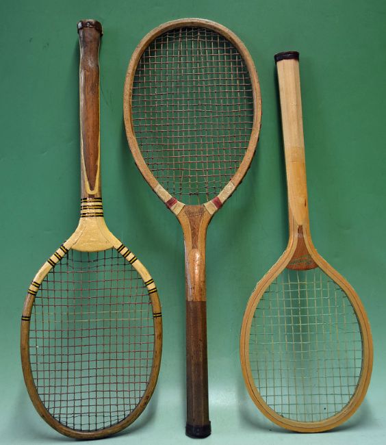 3x Lawn Tennis Rackets ranging from 1930 - 1950 the first is the "The Junior" measuring just 62.5 cm long^ it is in perfect unused condition^ with a laminated frame^ convex wedge and unbroken strings. Secondly - the "Diamond" with a concave wedge and perfect stringing. Finally a 20s'self-decorated' racket with a tapered handle^ and convex wedge - stringing perfect (3)