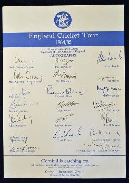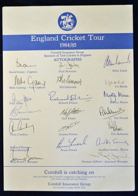 1985 England cricket tour signed team sheet part of the Cornhill Insurance having 19 signatures to include Gower^ Gatting^ Allott^ Cowans^ Cowdrey^ Downton^ Edmonds^ Ellison^ Foster^ Fowler^ French^ Lamb^ Marks^ Moxon^ Pocock^ Robinson^ Scorer^ Brown and Gifford signatures in ink and in G condition