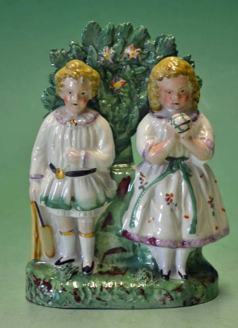 Original Vic Staffordshire ceramic cricket group of figures - comprising a boy holding a cricket bat wearing a white smock and a girl holding a ball^ in a three quarter length dress c/w tree back drop mounted on oval naturalistic base - overall 6"h. Note - Ex Keith Crump Collection Sept 2006 lot 373
