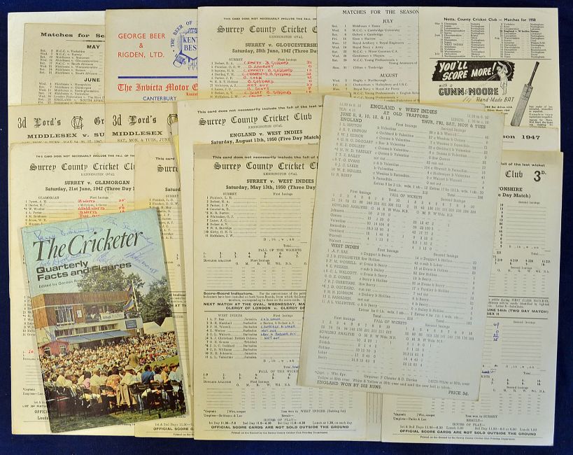 Collection of 1940s onwards cricket scorecards mainly county cricket including Kent^ Surrey^ Middlesex^ Somerset^ Yorkshire and some internationals 1950 England v West Indies^ Kent v South Africa and MCC v South Africa (23) t/w a signed 1974'The Cricketer' quarterly facts and figures handbook 10 signatures and in G condition^ worth inspecting (24)