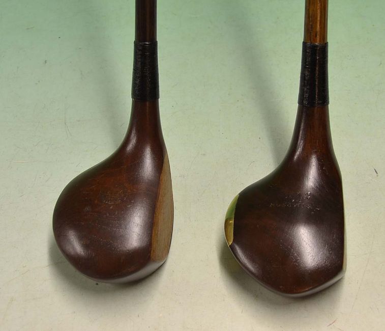 R Simpson'The Perfect Balance' brass back weighted stained persimmon driver t/w a Spalding crescent mark to the crown persimmon brassie^ both in superb condition and will full length original grips (2)