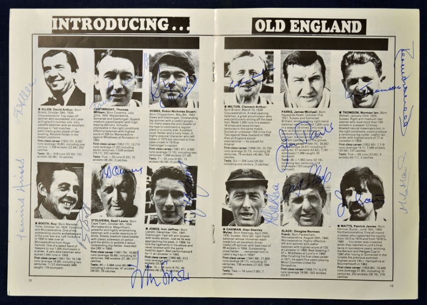 1988 Signed Copford Cricket Club v Samuel Whitbread's Old England charity match cricket programme at Copford^ dated 02/07/88 signed by the'Old England' team (16) featuring Allen^ Hobbs^ Booth^ D'Oliveira^ Jones^ Watts and more all in ink to the centre page in clear^ the programme is in VG condition