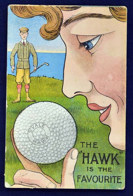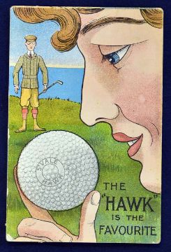 Scarce Springvale golf ball coloured postcard titled "The Hawk is the Favourite" - featuring a S'Vale Hawk Bramble Golf Ball - Close up of girl looking at the ball with male golfer in background. Used October 11th 1909.