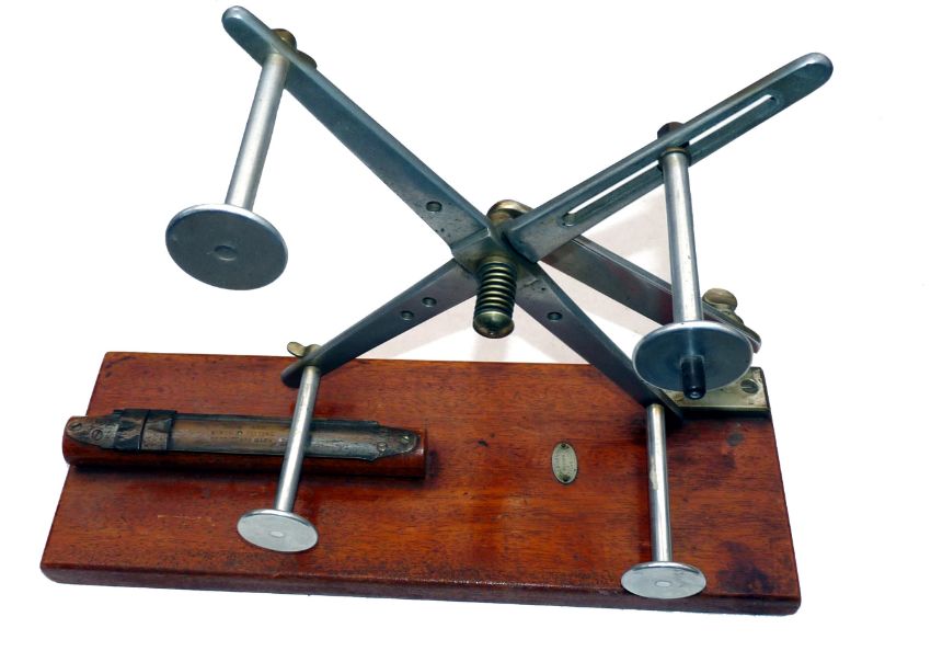 LINE DRIER: Hardy Practical table top line drier, mahogany base 14"x5", Hardy nickel oval logo plate, mahogany handle with iron arm, brass winch fitting, folding alloy frame with additional holes, all original, dates c1927.