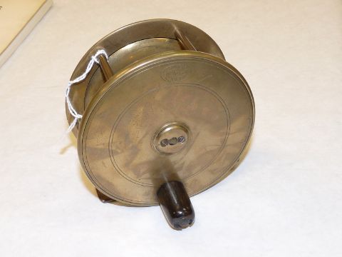REEL: Hardy 4" all brass Birmingham salmon fly reel, tapered horn handle (tiny chip to dome), Hardy oval logo to face plate, original screws and pillars, smooth check ratchet clicker, correct smooth brass foot, winds smoothly, polished finish.