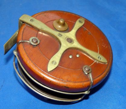 REEL: Early Coxon Aerial 4" wood backed narrow drum Centrepin reel, model 4104, 6 spoke, no tension regulator, ebonite drum stamped "Patent", 13/16" between flanges, tapered brown horn handles, brass star back with correct foot, optional check button to copper calliper check, nickel framed line guide, dates c1897, good early example.