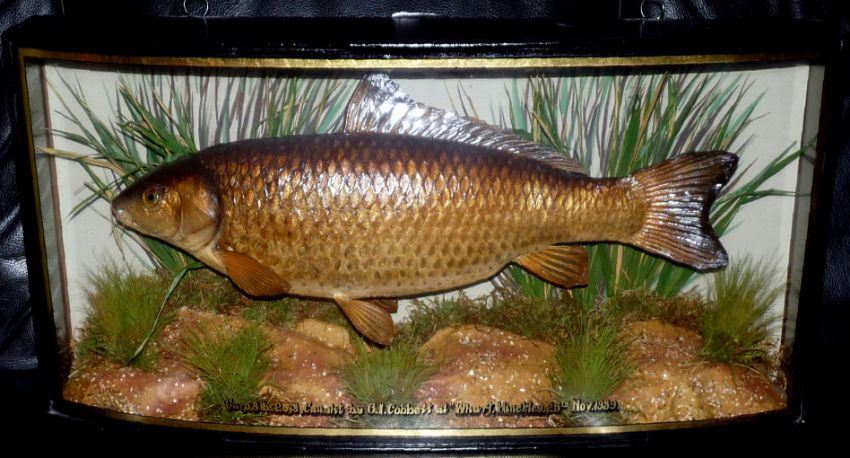 CASED FISH: Preserved Carp by Homer in gilt lined bow front case, green backboard, painted reeds, fully reeded over gravel base, gilt text "Carp 8lbs 2 oz., caught by GM Cobbett at Wharf, Hinckley 25th Nov 1939, case measures 31" x16" x7.5".