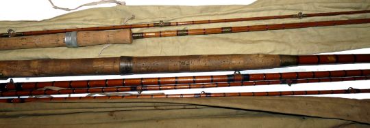RODS: (2) Victorian 15' 3 piece + spare tip, steel centre split cane salmon fly rod, close whipped FOB guides, lacking one tip ring, repair to butt, 26" sheet cork handle with Hardy style fittings and a hand built on Sharpe's cane 8' 2 piece spinning rod, burgundy close whipped, low bridge guides, bronze ferrule, 14" cork handle with light alloy reel rings.