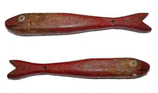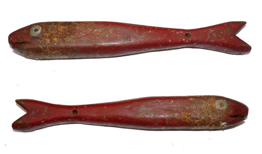 ACCESSORY: Unusual 19th century hand carved wooden fish priest, 11.5" long, lead eyes and weight to head, carved mouth, drilled to rear to accept a lanyard, retains most original red paint finish.