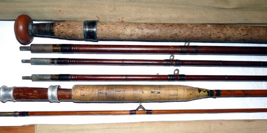 RODS: (2) Farlow & Co Ltd London 12'3 pce greenheart salmon fly rod c/w spare short top for heavy lines, brown whipped snake guides, 26" cork handle, brass reel rings and Farlow 9' 2 pce split cane fly rod, bronze push ferrules, cork handle, wood reel seat, alloy screw winch fitting, Fuji guides whipped green, with makers bag and wood support