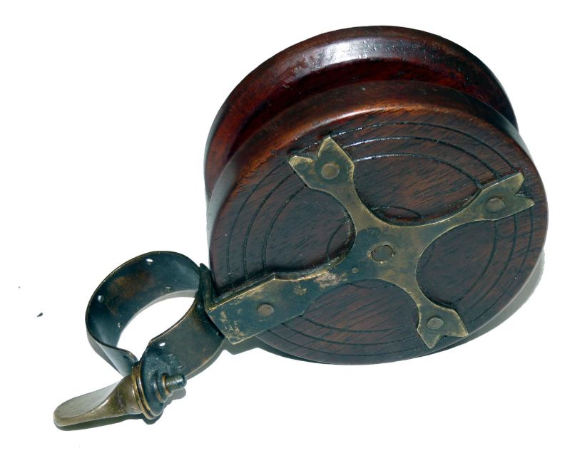 REEL: Scarce Nottingham mahogany/brass collar fitting winch, 3.75" diameter drum, deep dish with central lock screw, shaped bone handles on rectangular plates, tapered edge to drum front, shallow spool, gothic style brass star back, with collar fitting and lyre screw, good patina.