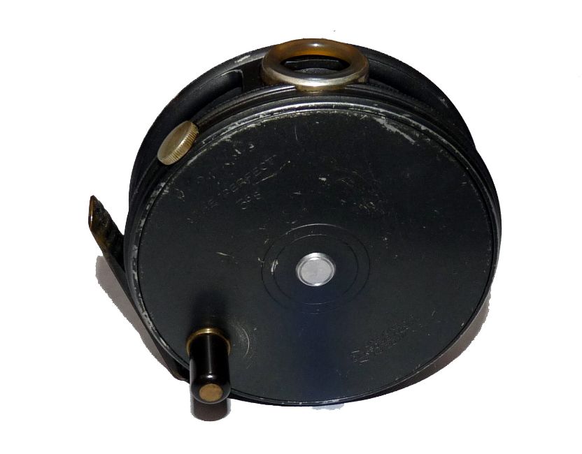 REEL: Hardy Perfect 3 5/8" alloy trout fly reel, Mk2 check, black handle, rim tension regulator, good smoke agate line guide, ribbed brass foot, generally good, retaining most original dark finish.