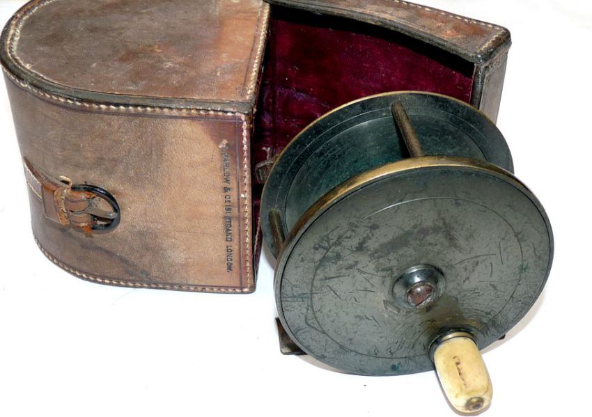 REEL & CASE: Farlow 191 Strand London all brass plate wind trout fly reel, 3.5" diameter with ivory handle, makers details engraved to backplate, large screw face, smooth check, original pillars screws and foot with Fish trade mark, fine original dark bronze finish c/w Chas Farlow & Co Ltd block leather case, red baize lined, original strap and buckle, one side stitching lose otherwise good.