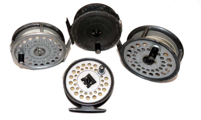 REELS: (4) Four Hardy reels, Marquis 8/9 alloy fly reel, black handle U shaped line guide, smooth alloy foot, Viscount 150 fly reel and a 130 fly reel , both with U shaped line guide, castle drum release and backplate tension adjusters and a Uniqua Mk2, 3-3/4" alloy fly reel with fixed check, all used serviceable reels & lines.