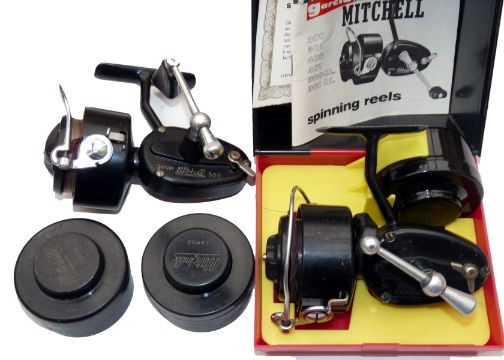 REELS: (2) & SPOOLS: (3) Early French Mitchell 300 spinning reel, spring fold handle, V shape check, c/w spare spool in tub, handbooks, in original black red box and a Garcia Mitchell 300 spinning reel, screw fold handle, good original finish, c/w 2 spare spools in tubs.