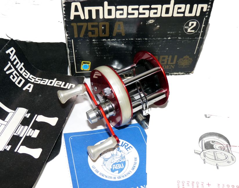 REEL: Abu Ambassadeur 1750A multiplier reel in as new condition, foot stamp 761001, twin pearl handles and sandwich plate, c/w handbooks, leaflets and drawstring bag, in MOB.