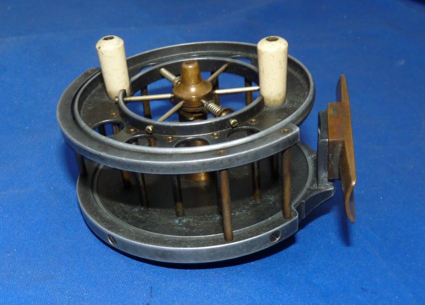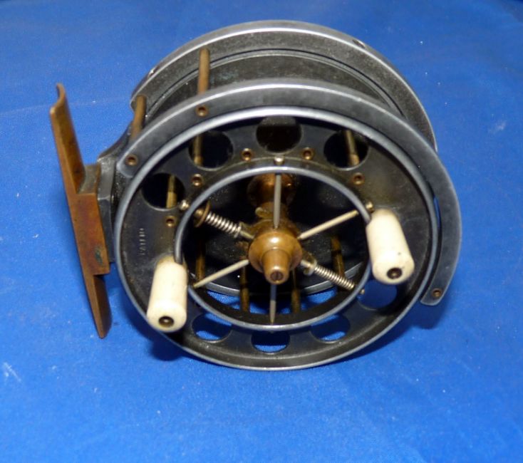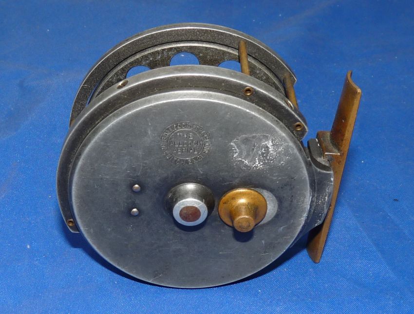 REEL: Early Allcock 3" alloy Aerial trotting reel, 6 spoke with tension regulator, face plate stamped "Patent", with 8 large ventilations, wide drum model, 1" between plates, BP line guide with brass pillars, correct brass foot, brass on/off check button to early copper calliper check, backplate internally stamped "9297", Allcock circle logo to backplate, spins straight and well, retaining good dark lead finish.