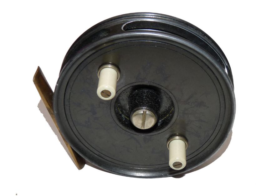 REEL: Wallace & Kerr Edinburgh by Youngs model No.7, narrow drum alloy fly reel, 3.75" diameter, .75" overall width, twin white handles on nickel cusps, raised central boss & screw, rim tension regulator, retains virtually all original finish.