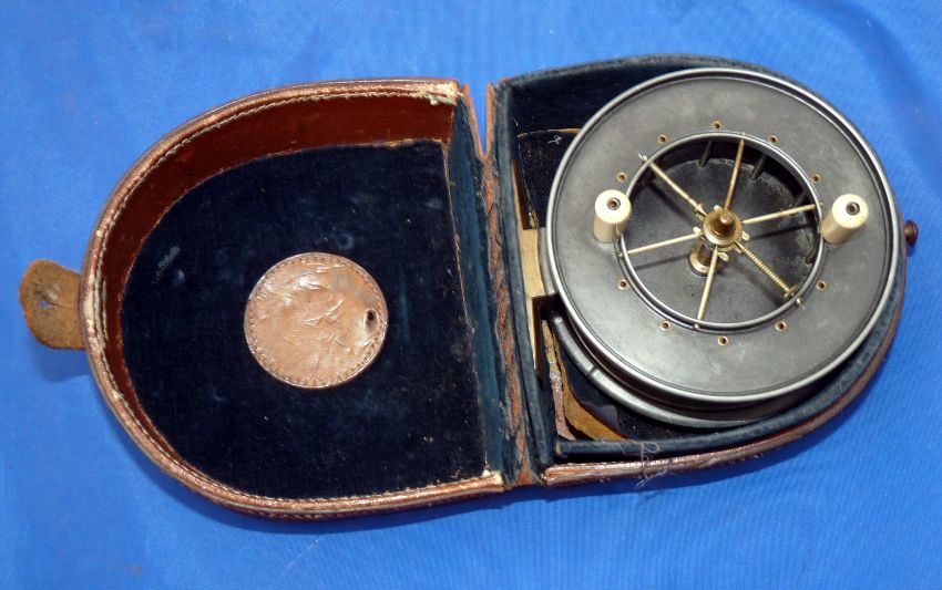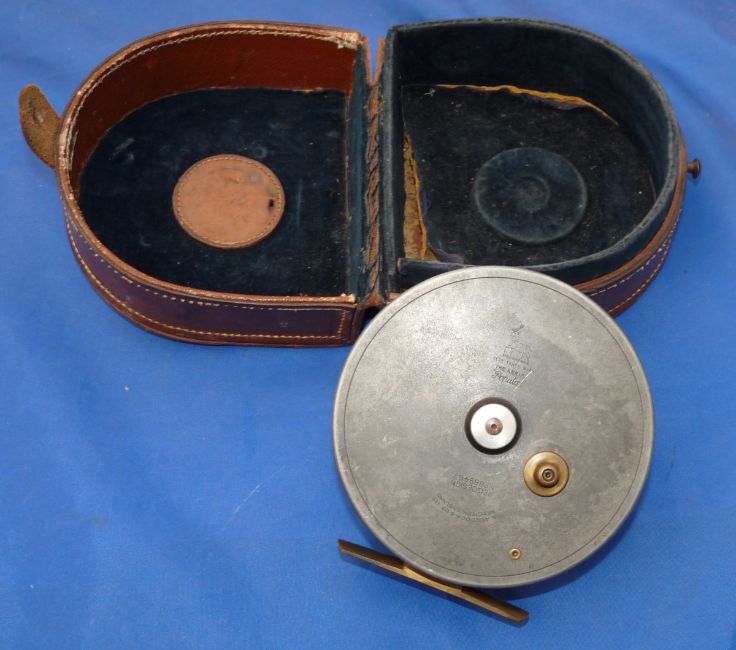 REEL & CASE: (2) Allcock Aerial Popular 4.5" alloy Centrepin reel, in fine condition, 6 spoke with tension regulator, twin ivorine handles, solid face plate, measures 1.25" between flanges, correct smooth brass foot, backplate stamped "Allcock Aerial Popular" with stag logo and registered design numbers, brass on/off check button to V spring and Pawl, retains virtually all dark lead finish, spins straight and well, in fitted block D shaped case, a/f.