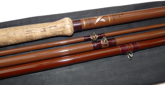 ROD: Bruce & Walker "The Cairngorm" 14'6" 3 piece + spare mid-section, brown hollow glass salmon fly rod, line rate 9/10, low bridge guides whipped brown, 29" cork handle with screw reel fitting, good, in MOB.