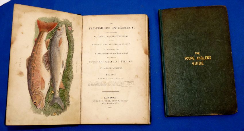 Ronalds, A - "The Fly Fishers Entomology" 1839 2nd edition with 20 copper plates, some staining to top right quarter pages, black leather binding, gilt ribbed spine and Cheek, J - "The Young Angler's Guide" 1839 with litho plates, generally clean, embossed green cloth binding, 2 early copies. (2)