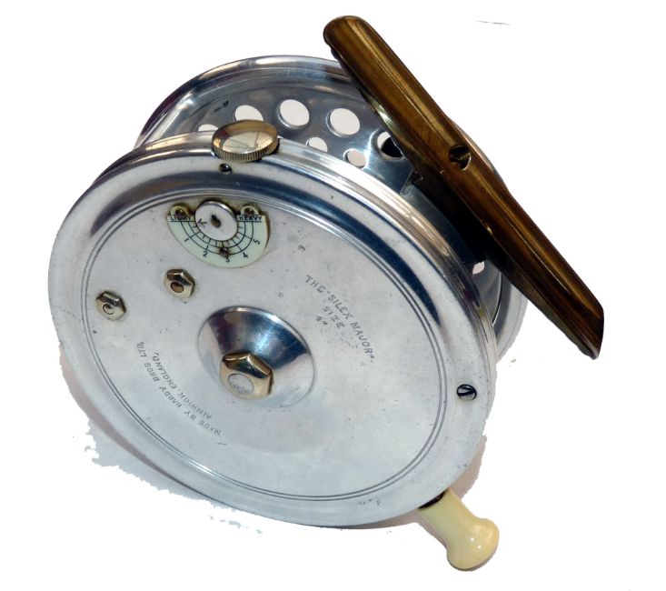 REEL: Rare Hardy The Silex Major 4" Hiduminium bright finish casting reel, twin black handles, button release, ventilated face plate, ivorine trigger knob and half-moon scale to rim tension regulator, correct ribbed brass foot, internally stamped by Hardy reel maker "P W" and with large letter "H" to underside of check, superb condition throughout.