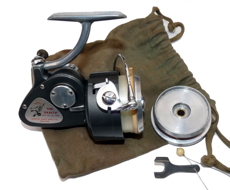 REEL: Fine Hardy Exalta spinning reel, Mk2 model with optional check, folding handle, reversible alloy stem, retaining virtually all original finish, c/w spare spool and spanner in drawstring bag.