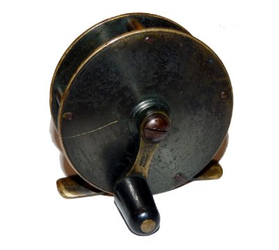 REEL: Early Hardy 2.5" all brass narrow drum crank wind winch, winding arm stamped Hardy's Alnwick, black horn handle, original pillars, screws and foot, retains most original bronzing, fine early example.