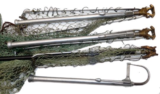 LANDING NETS & GAFF: (4) Collection of 3 vintage folding landing nets, 2 x with alloy extending handles and 18" alloy arms, stamped "Made in Great Britain", original knotted mesh and belt clips, a similar folding landing net and a 2 draw alloy salmon gaff with point protector and belt clip.
