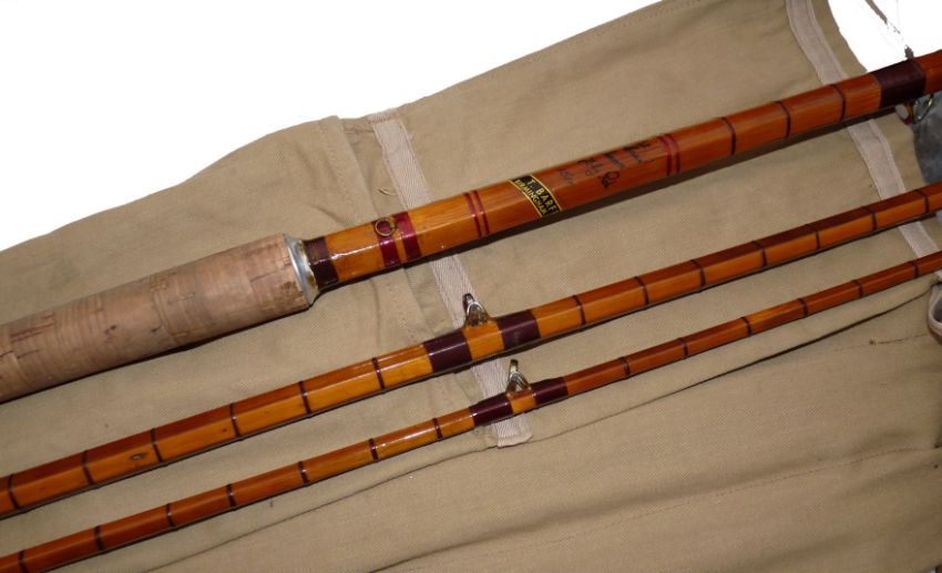 ROD: T V Barfield of Birmingham 14'6" 3 piece split cane salmon fly rod, burgundy close whipped red agate guides all through, heavy duty bronze ferrules, 28" cork handle with nickel screw winch fitting, decorative powerful rod, in MOB.