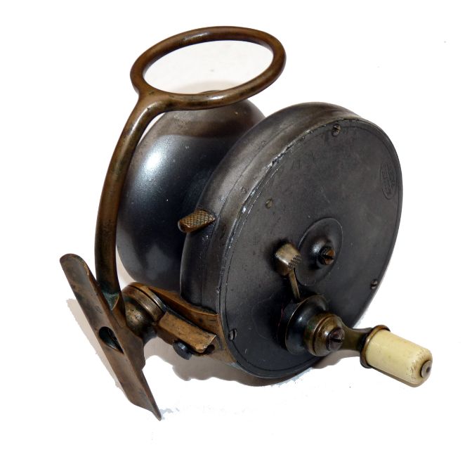 REEL: Rare Malloch multiplier alloy side casting reel, 4" diameter backplate, off set geared crank handle, slide lock pin, side lever ratchet check, reversible wide alloy drum, brass twisting foot with casting eye, knurled slide lock button, rarely seen reel, some refinishing.