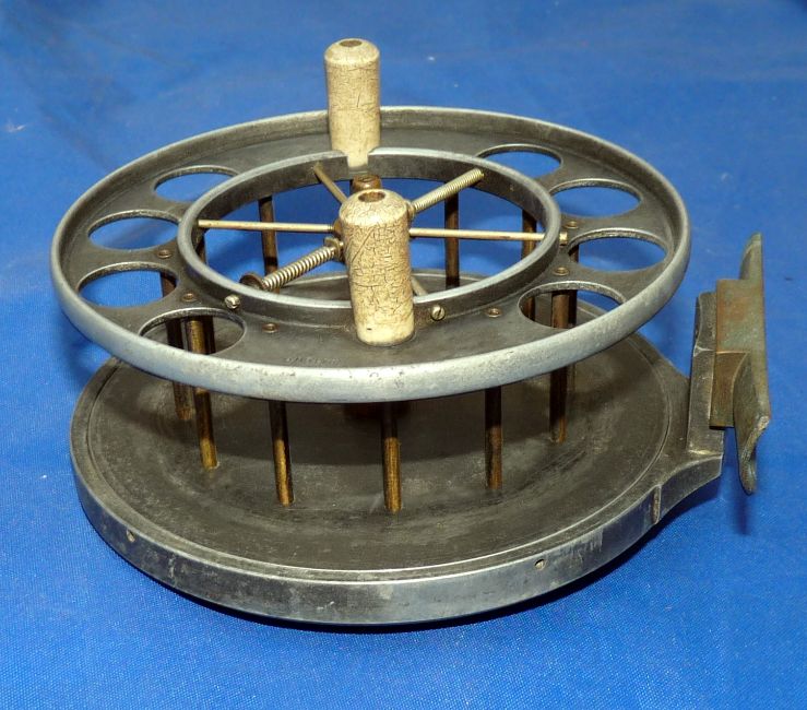 REEL: Early 4.5" diameter Allcock Aerial wide drum Centrepin reel, 6 spoke with tension regulator, face plate stamped "Patent", with 8 large ventilations, twin ivorine handles, correct smooth brass foot, on/off check button to early bronze calliper check, internally backplate stamped "25383", externally stamped with Allcock circle logo, spins straight and well.