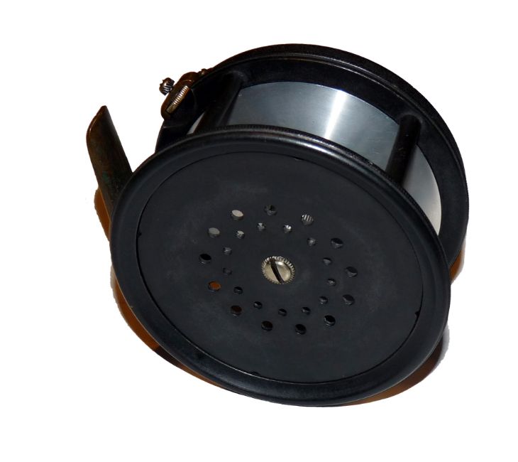 REEL: Fine Hardy Perfect brass faced alloy salmon reel, 3.75" diameter, ivorine handle, face plate stamped with rod in hand and straight line logos, strapped rim tension regulator with Turks lock screw, 1905 calliper check, internally stamped "RBA", correct smooth 4 screw brass foot, dished face plate with 2 rows of small perforations, 4 cusps to spool, frame re leaded by Hardy, fine throughout, no visible cracks, damage or spindle wobble.