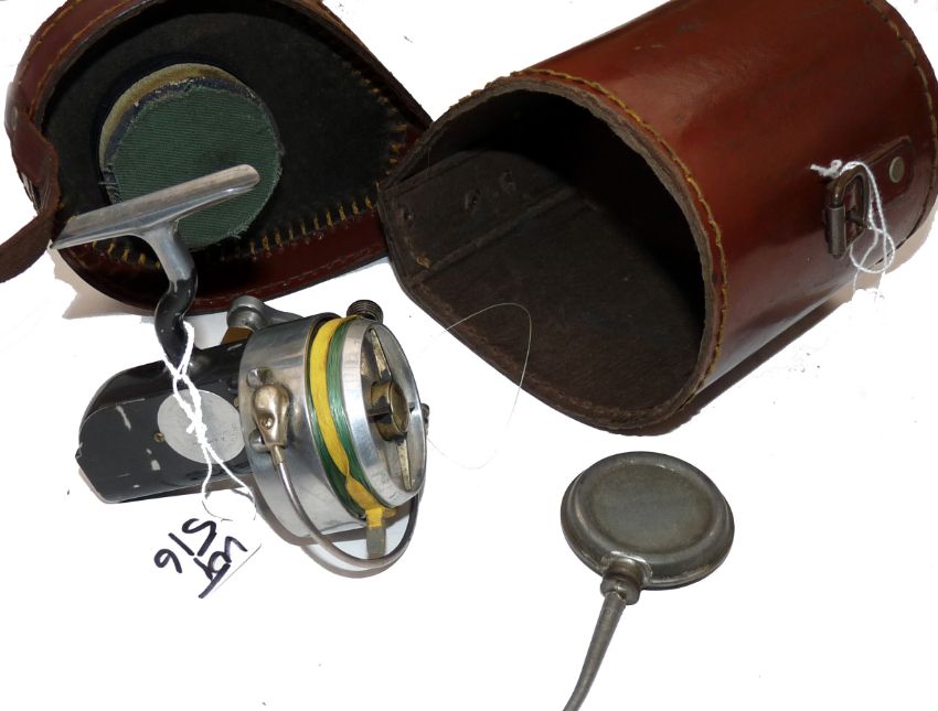 REEL & CASE: Hardy Altex No.2 MkV spinning reel in fine condition, LHW folding handle, good spring bail, constant check, reel retains most original finish, in maker's pear shaped leatherette case with original strap and buckle.