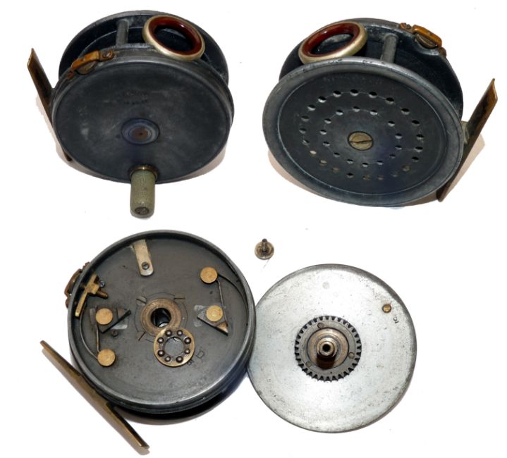 REEL: Early Foster Bros of Ashbourne by Dingley Perfect style 3.5" alloy trout fly reel, internally stamped "D3", red agate line guide, crazed white handle, strapped tension regulator, 2 rows of perforations to face plate, good early example, retaining good dark lead finish.