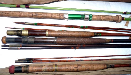 RODS: (4) James Ogden maker Cheltenham 9' 3 piece split cane trout fly rod, bronze ferrules, agate butt/tip rings, cork handle with brass fittings, a 10' 3 piece greenheart trout fly rod, snake guides, bronze ferrules, sheet cork handle, a similar 9' greenheart fly rod with spare top, green whipped snake guides, sheet cork handle with wood reel seat and an unnamed 8' 2 piece fibreglass spinning rod with low bridge guides.