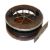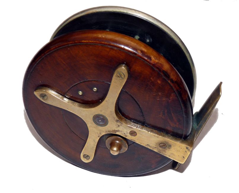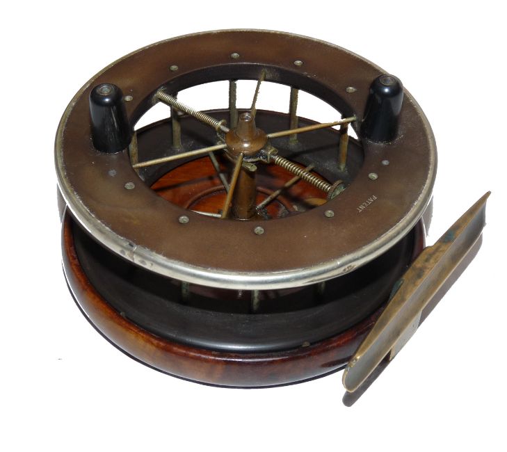 REEL: Fine Allcock's Coxon 6 spoke Aerial reel, 4.5" diameter, wood backed with ebonite drum, nickel silver binding to front rim, stamped Patent, tension regulator, twin black handles, brass star back, with correct foot, ratchet on- off check, copper calliper check, fine condition, spins well.