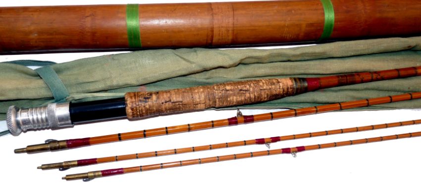 ROD: Hardy The Fairey 9'6" 3 pce Palakona trout fly rod No A21747B , two tips, 5" and 6" short, red whipped agate butt and tip rings, snake intermediates close whipped green, bronze lock fast ferrules,8" cork handle, alloy screw reel fitting, bronze ferrules, revarnished some time ago, in non-original cloth bag and bamboo tube, lacks top card.