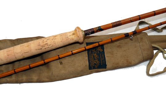 ROD: JS Sharpe of Aberdeen The Scottie 10' 2 piece split cane trout fly rod, agate butt/tip rings, low bridge intermediates, burgundy close whipped, bronze lock fast ferrule, 10" cork handle over up screw reel seat, fine, in MOB.