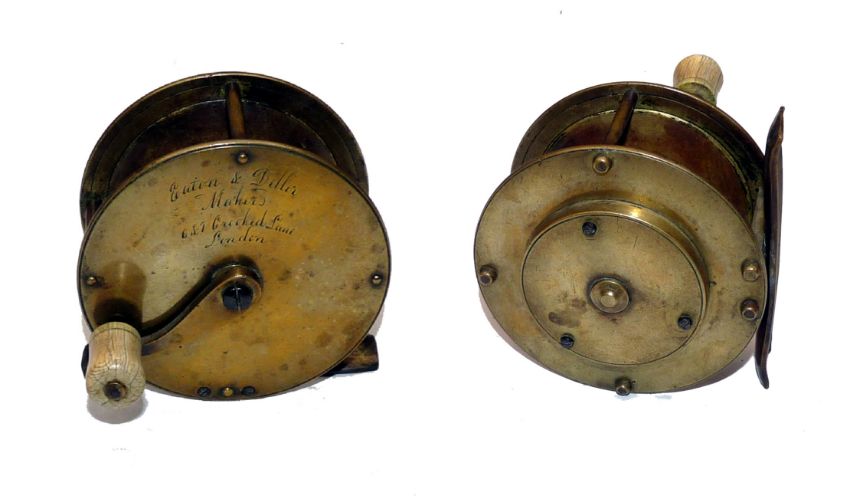 REEL: Early Eaton & Deller 3.25" all brass crank wind winch, 6/7 Crooked Lane London address script engraved to face plate, curved winding arm, ivory knob, 5 pin brass foot and raised rear check housing, all original pillars and lock screws, good early winch.