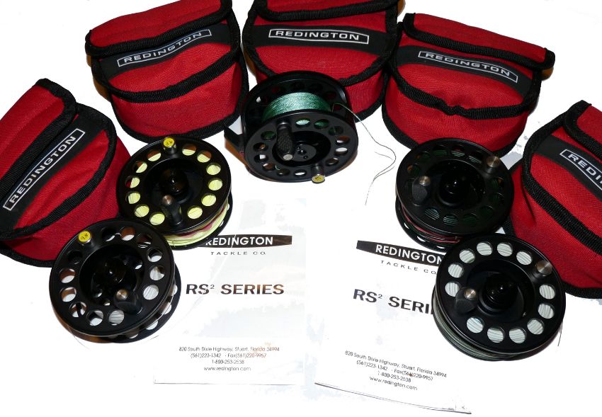 REEL & Spools: (5) Reddington USA RS2 hi tech alloy trout fly reel, 3.5" diameter, large arbour wide drum reel, rear disc drag adjuster, counter balanced handle, c/w 4 spare spools, assorted lines, 2 leaflets and 5 Reddington Cordura cases.
