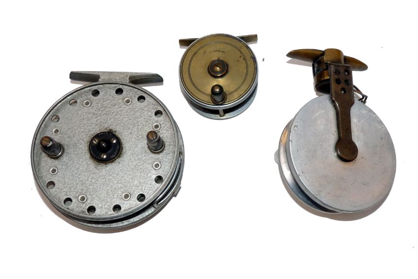 REELS (3): Grice & Young Avon Royal Supreme 4.5" diameter trotting reel, gold finish, lever check, spares in backplate, fine, 2.5" bi metal brass & alloy fly reel face stamped Made in England, horn handle check ratchet and an alloy and brass tournament style twisting foot reel, 3.25" shallow alloy drum, brass line guide, lacks drum screw otherwise good interesting reel.