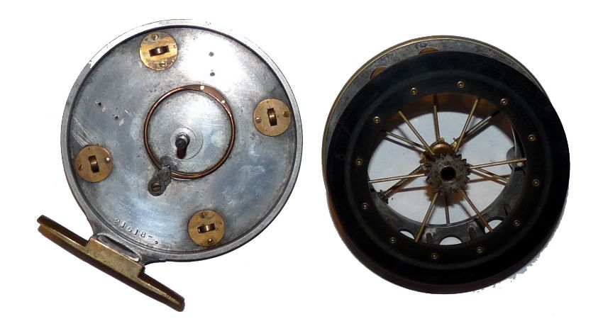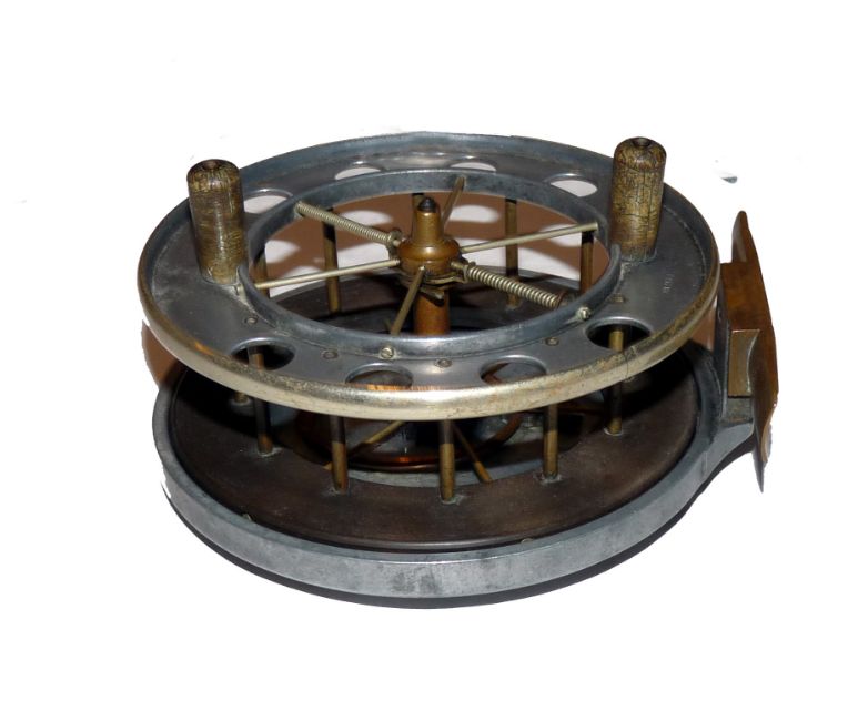 REEL: Extremely rare Roller back Coxon Aerial reel with German silver front rim binding, 4.5" diameter, 6 spoke with no tension adjuster, wide drum lacquer over bright finish alloy, front flange stamped Patent and with 8 medium diameter ventilation holes, smaller than normally seen on this model, twin crazed handles, ebonite rear flange, 4 brass rollers recessed into alloy backplate, stamped 21618, correct smooth brass foot, backplate stamped The Allcock Aerial in Allcock's circle logo, brass on off check button, early copper calliper check inside, spins well only just touching the rollers, rare Roller back variant, dates c1904-10