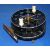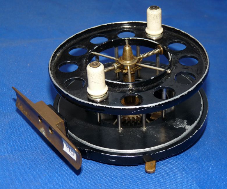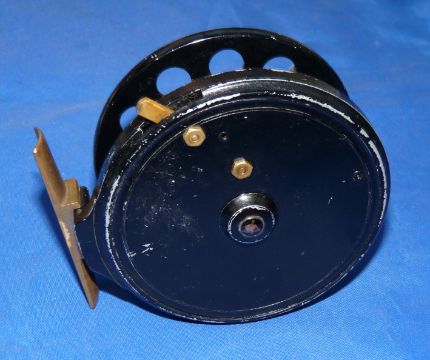 REEL: Allcock Aerial 4" wide drum alloy trotting reel, side lever check, black finish, twin crazed white bottle handles, 6 spoke tension regulator, 10 large holes to face plate, correct smooth brass foot, backplate stamped with Allcock stag logo, Allcock Aerial and Registered design numbers, drum width 1 1/8", reel spins well, retains most original black finish.