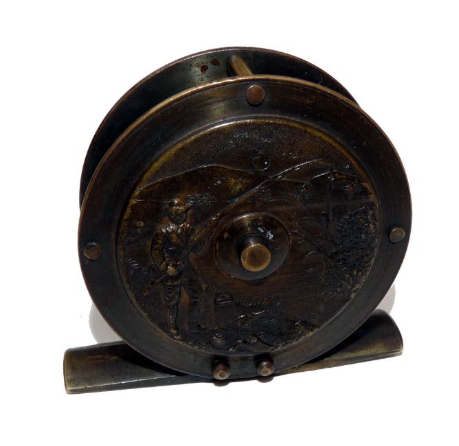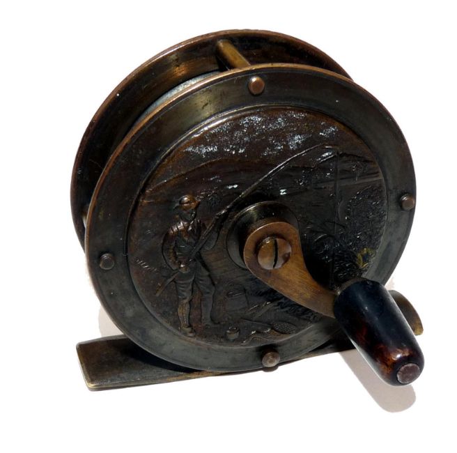 REEL: Fine original Heaton's fishing scene reel, 2.5" diameter, narrow drum with vast embossed fishing scene to front and rear plates, curved winding arm, polished horn handle, correct foot, retains virtually all original finish, fine example.