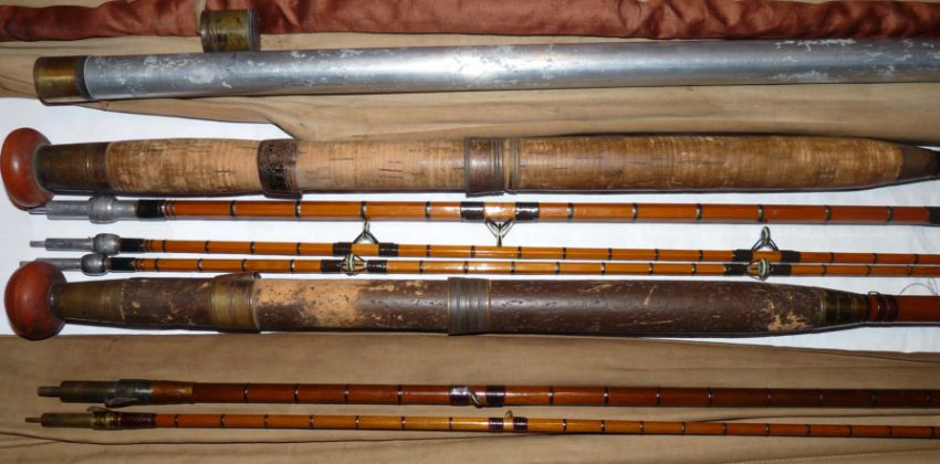RODS: (2) Farlow 12' 3 pce with correct spare tip Holdfast cane salmon fly rod, refurbished with green whipped Fuji guides for modern lines, Holdfast ferrules with Farlow stamp to each screw cap, cork handle, brass fittings red button c/w alloy tip tube in MOB and a Wallace & Kerr Edinburgh 12' 3 pce greenheart salmon fly rod, FOB snake guides, bronze ferrules, 16" cork handle, brass fittings and red button in MOB.