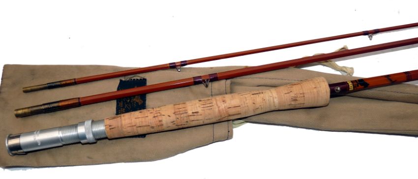 ROD: JS Sharpe The Aberdeen 10' 3 piece impregnated cane trout fly rod, red agate butt/tip guides, burgundy whipped low bridge intermediates, copper whipped bronze ferrules, 9" cork handle over alloy up screw reel seat, fine, in MOB.
