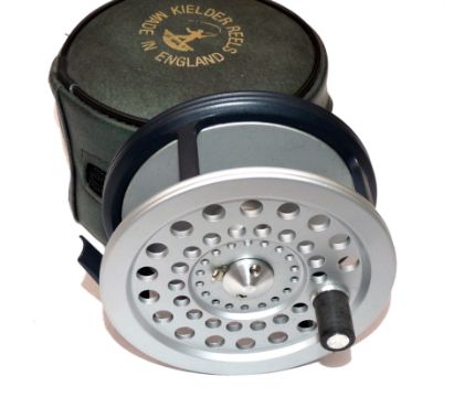 REEL: The Kielder Reel 4.25" alloy wide drum salmon fly reel, 2 screw drum latch, calliper check with adjuster to backplate, left or RHW, as new condition, in maker's zip padded case.