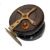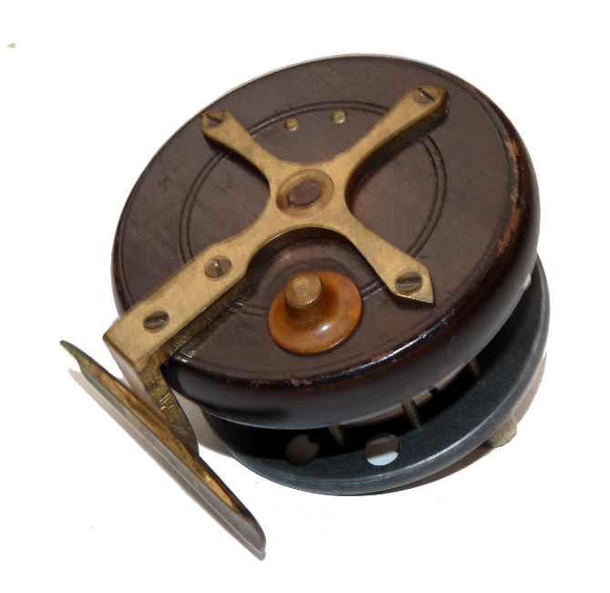 REEL: Rare Allcock's 3" Improved Coxon Aerial reel, 6 spoke with tension regulator, twin white crazed handles, ventilated drum, 7/8" between plates, mahogany backplate, brass starback with correct foot blade, stamped 25610 to return, brass on off check button, copper calliper check and brass liner to inside of backplate, fine throughout, spins true and well, rare size and model